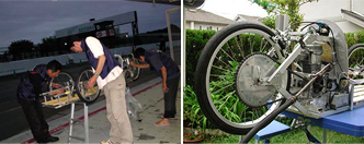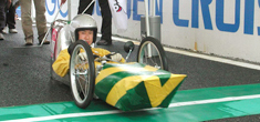 3人は同じ大手自動車メーカーに就業しており、車両製作ではそれぞれの創意工夫がなされました。ドライバー上野の体型に合うようにプラベニヤ板に図面を描くことから始め、材料(アルミ)を図面通りに組み上げ、溶接設備不足のため接続部はビス止めに。車体で最も苦労したのがステアリング関係で、本番直前まで試行錯誤続きだったそうです。